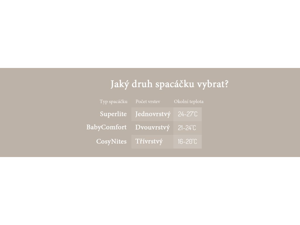- Spacáček zároveň zajišťuje dítěti stálý tepelný komfort a tím pádem zdravý, pohodlný a bezpečný spánek.