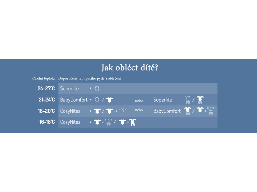 Je důležité zvolit správnou tloušťku spacího pytle, pravidelně kontrolujte, zda není vašemu miminko příliš teplo nebo zima. Hlavním kritériem pro vyhodnocení není teplota ručiček, ale zátylek miminka. Když je zátylek teplý, je dítě oblečené vhodně. Pokud je zátylek horký či studený, je nutné jednu vrstvu oblečení přidat nebo ubrat.